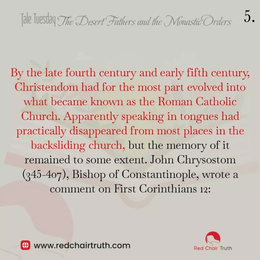 By the late fourth century and early fifth century, Christendom had for the most part evolved into what became known as the Roman Catholic Church. Apparently speaking in tongues had practically disappeared from most places in the backsliding church, but the memory of it remained to some extent.