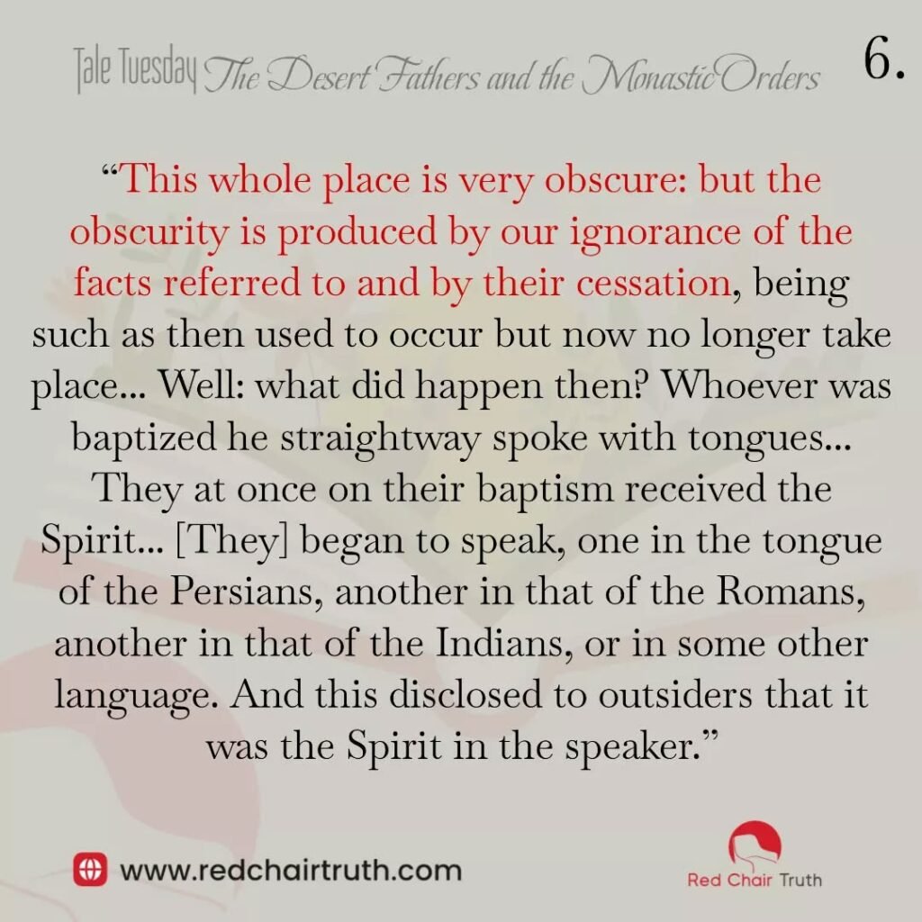 John Chrysostom (345-407), Bishop of Constantinople, wrote a comment on First Corinthians 12: “This whole place is very obscure: but the obscurity is produced by our ignorance of the facts referred to and by their cessation, being such as then used to occur but now no longer take place… Well: what did happen then? Whoever was baptized he straightway spoke with tongues… They at once on their baptism received the Spirit… [They] began to speak, one in the tongue of the Persians, another in that of the Romans, another in that of the Indians, or in some other language. And this disclosed to outsiders that it was the Spirit in the speaker.”