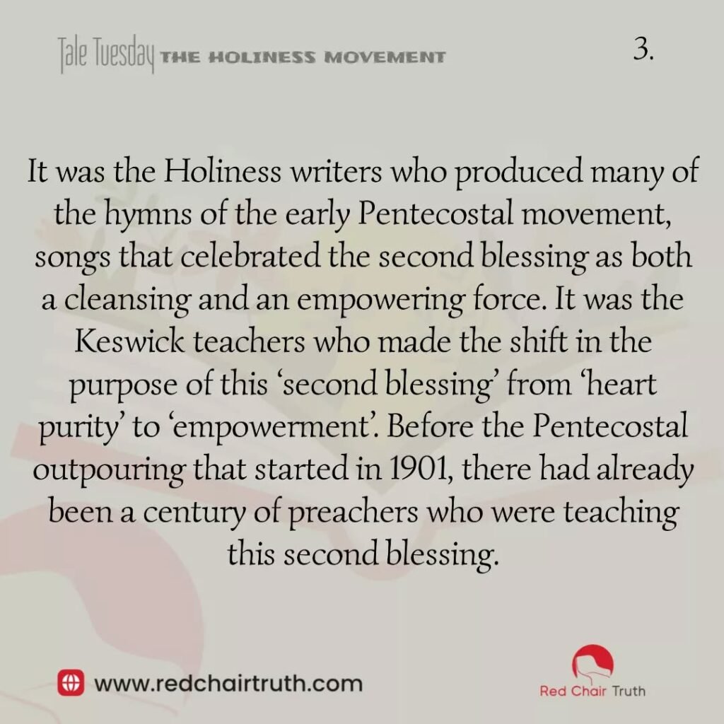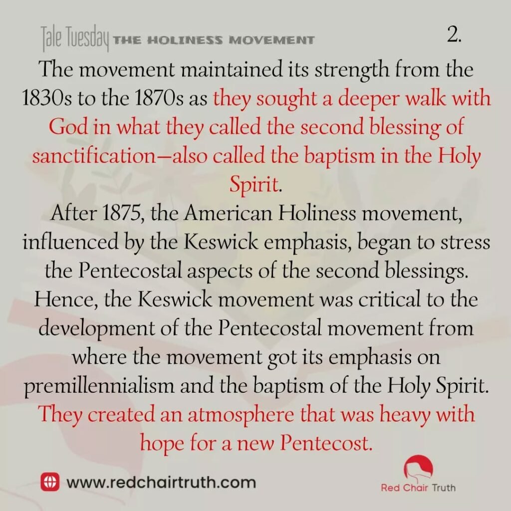 Post-1875, the movement, influenced by Keswick, started stressing Pentecostal aspects of the second blessing. Keswick played a big role in developing the Pentecostal movement, emphasizing premillennialism and Holy Spirit baptism. Holiness writers penned early Pentecostal hymns, celebrating the second blessing as cleansing and empowering.