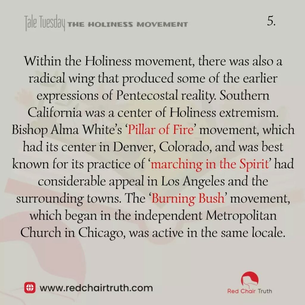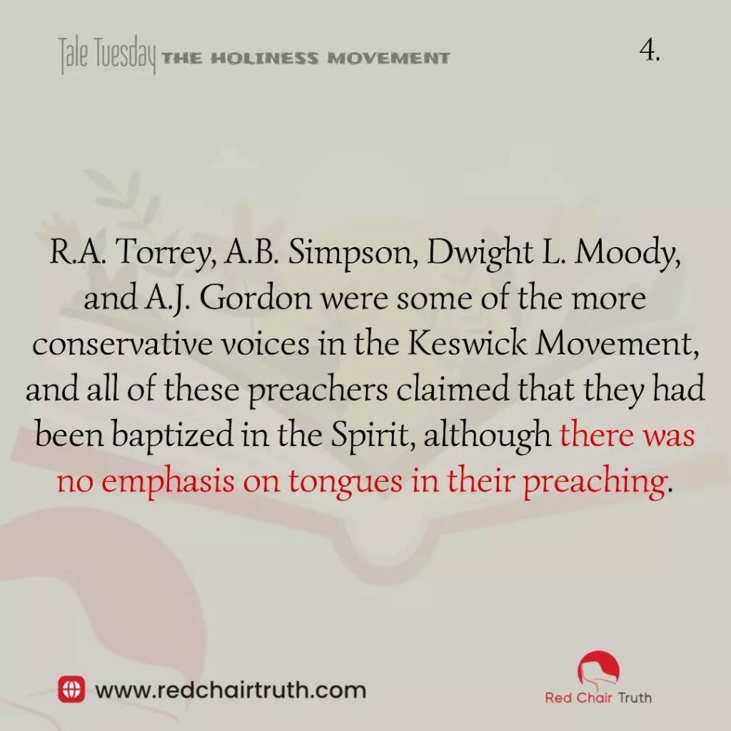 Preachers like R.A. Torrey, A.B. Simpson, Dwight L. Moody, and A.J. Gordon claimed Spirit baptism without emphasizing tongues. The radical Holiness wing had extremist expressions, like Bishop Alma White’s “Pillar of Fire” and the “Burning Bush” movement. In 1896, Baptists in North Carolina experienced revival with speaking in tongues and healing miracles.