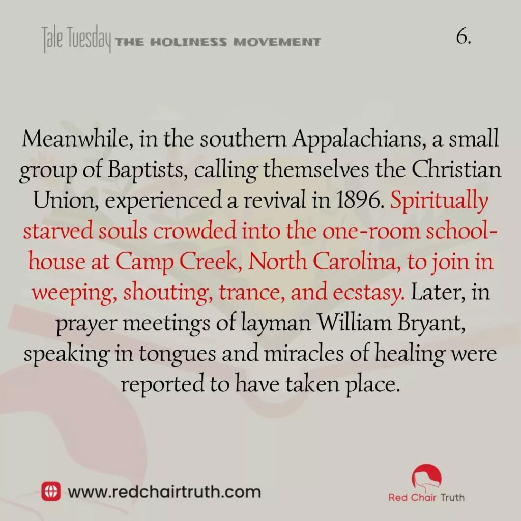 The Holiness movement kicked off in the US within Methodism, focusing on getting back to personal holiness. By the late 19th century, revival meetings were huge, leading to the National Holiness Camp Meeting Association (1867) in Vineland, New Jersey. They sought a “second blessing” of sanctification, aka baptism in the Holy Spirit.