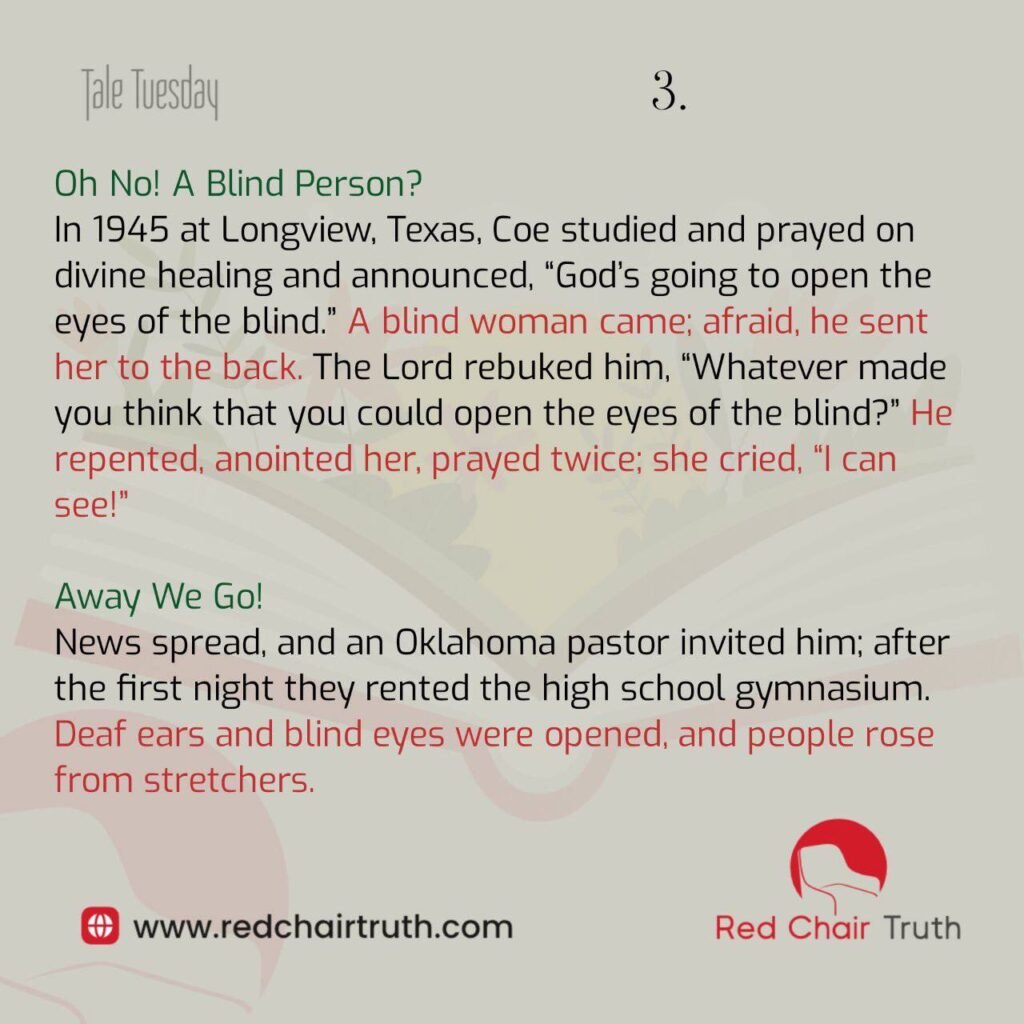 In 1945 at Longview, Texas, Coe studied and prayed on divine healing and announced, “God’s going to open the eyes of the blind.” A blind woman came; afraid, he sent her to the back. The Lord rebuked him, “Whatever made you think that you could open the eyes of the blind?”