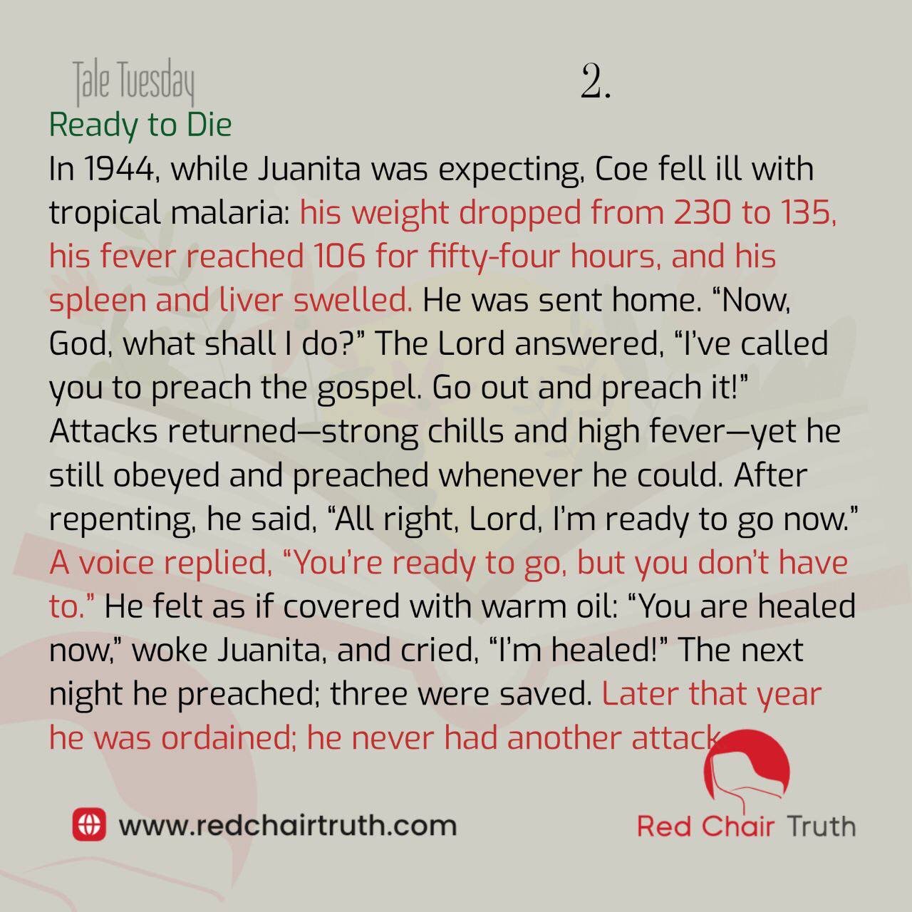 Coe tried to pray for everyone, often until five in the morning. People woke him for prayer; with little sleep, his body began to break down. God told him to use wisdom and rest. He obeyed and was revitalized to pursue a stronger ministry to the sick.