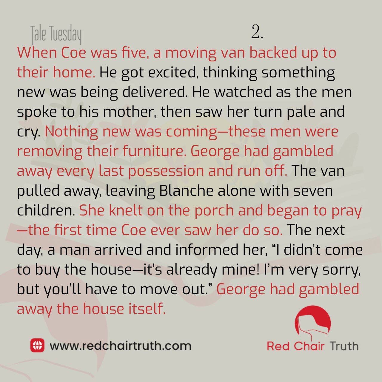 When Coe was five, a moving van backed up to their home. He got excited, thinking something new was being delivered. He watched as the men spoke to his mother, then saw her turn pale and cry. Nothing new was coming. These men were removing their furniture. George had gambled away every last possession and run off. The van pulled away, leaving Blanche alone with seven children. She knelt on the porch and began to pray, the first time Coe ever saw her do so.