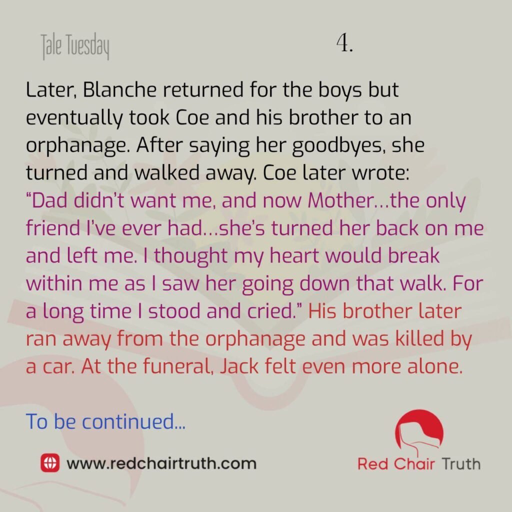 Later, Blanche returned for the boys but eventually took Coe and his brother to an orphanage. After saying his goodbyes, she turned and walked away. Coe later wrote: “Dad didn’t want me, and now Mother…the only friend I’ve ever had…she’s turned her back on me and left me. I thought my heart would break within me as I saw her going down that walk. For a long time I stood and cried.” His brother later ran away from the orphanage and was killed by a car. At the funeral, Jack felt even more alone.
