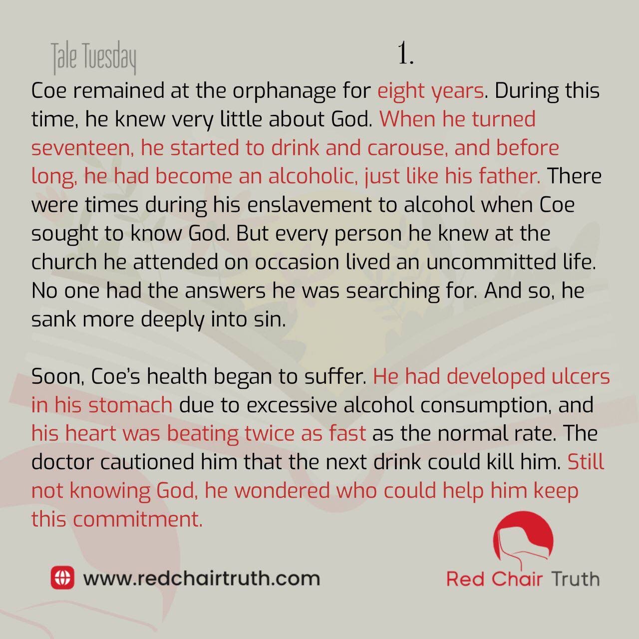 This led him to move to California. His sister invited him to a dance. But soon, Coe found himself at the bar. He was brought home that night in a drunken stupor. He cried out, “GOD, GIVE ME UNTIL SUNDAY!” The next evening, Coe thought he was dying. He raised his hands, pleading, “Oh God, don’t let me die; please give me one more chance. I don’t want to go to hell.” Then suddenly, Coe got better.