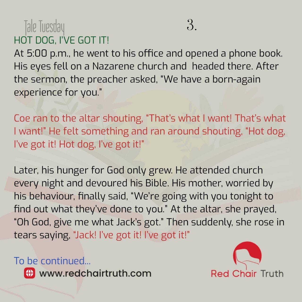 At 5:00 p.m., he went to his office and opened a phone book. His eyes fell on a Nazarene church and he headed there. After the sermon, the preacher asked, “We have a born-again experience for you.” Coe ran to the altar shouting, “That’s what I want! That’s what I want!” He felt something and ran around shouting, “Hot dog. I’ve got it! Hot dog, I’ve got it!”