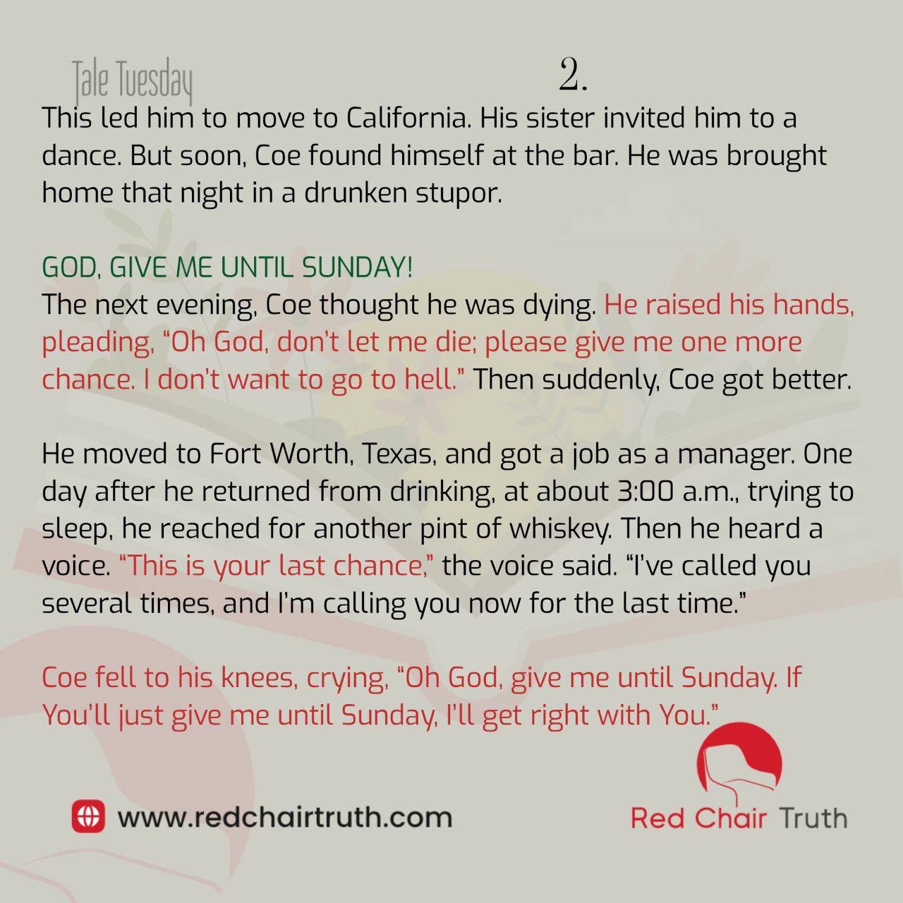 He moved to Fort Worth, Texas, and got a job as a manager. One day after he returned from drinking, at about 3:00 a.m., trying to sleep, he reached for another pint of whiskey. Then he heard a voice. “This is your last chance,” the voice said. “I’ve called you several times, and I’m calling you now for the last time.” Coe fell to his knees, crying, “Oh God, give me until Sunday. If You’ll just give me until Sunday, I’ll get right with You.”