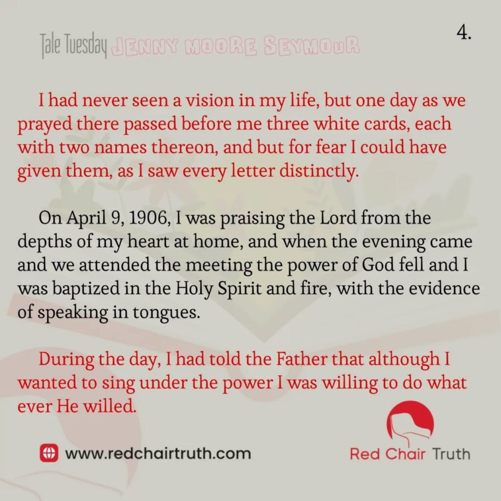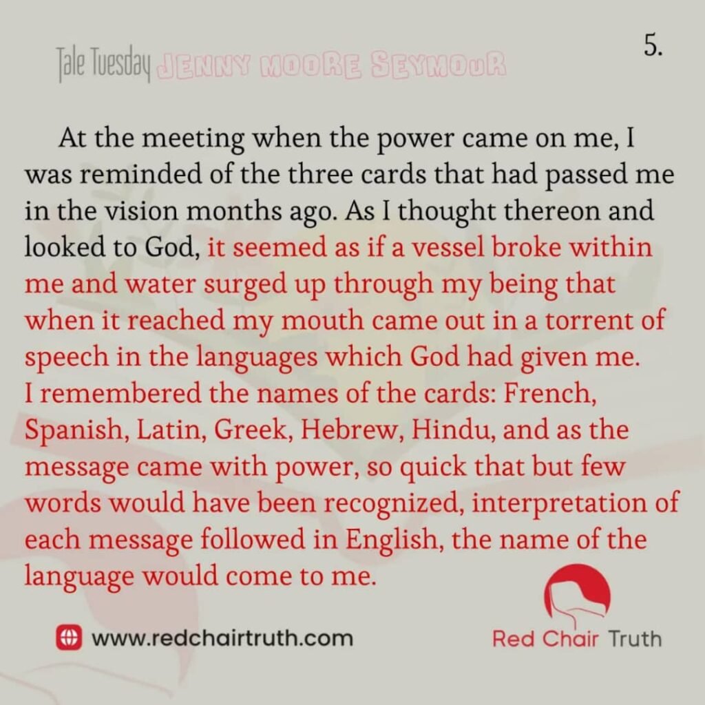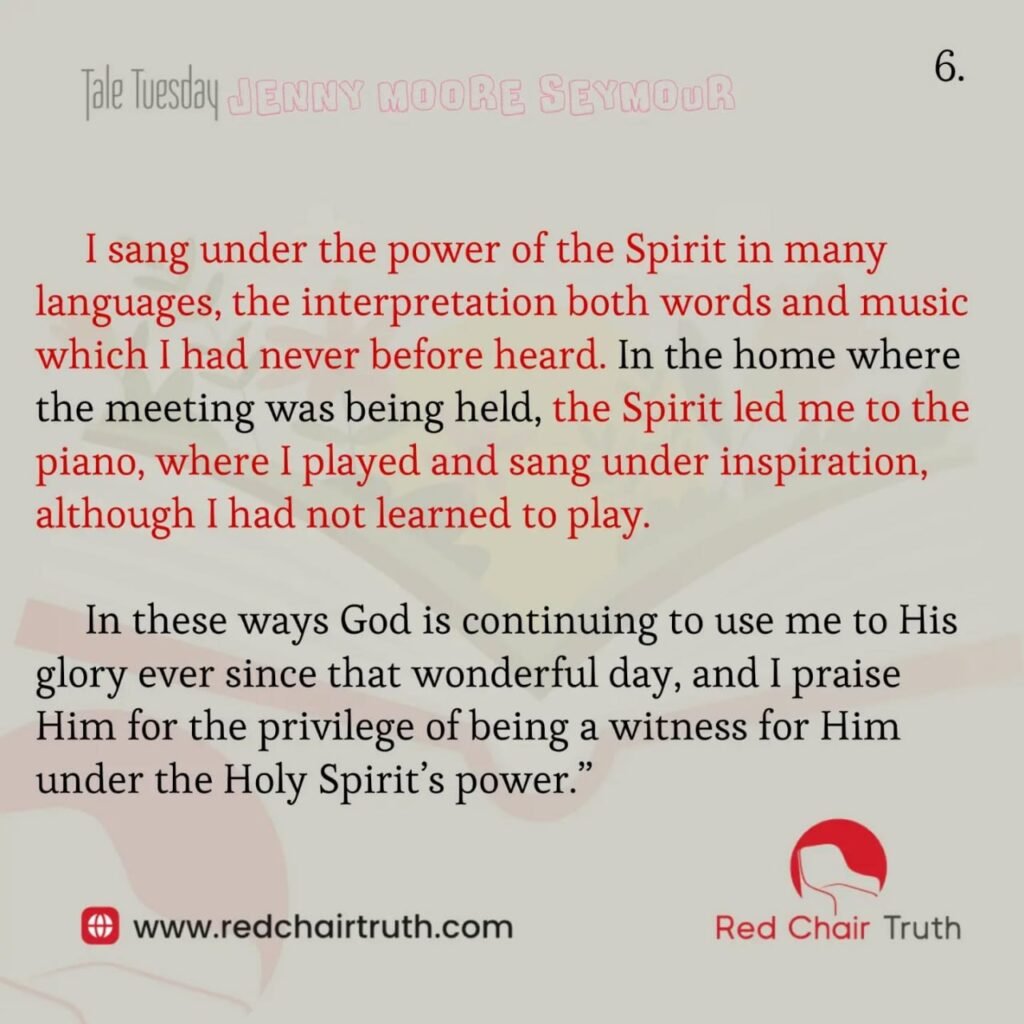 After receiving the baptism, Jenny began to sing in tongues and play the piano under the power of God, despite never having played before. She testified to receiving visions and speaking in multiple languages.
