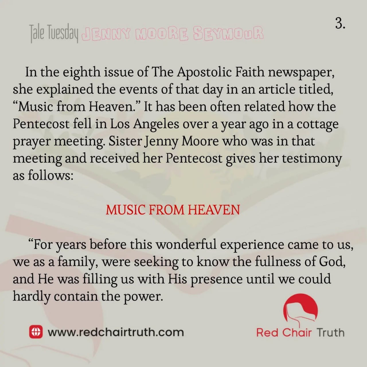 In “Music from Heaven” (The Apostolic Faith, issue 8), Jenny shared her experience: “I was praising the Lord… when the power of God fell and I was baptized in the Holy Spirit and fire, with the evidence of speaking in tongues… God is continuing to use me to His glory ever since that wonderful day.”