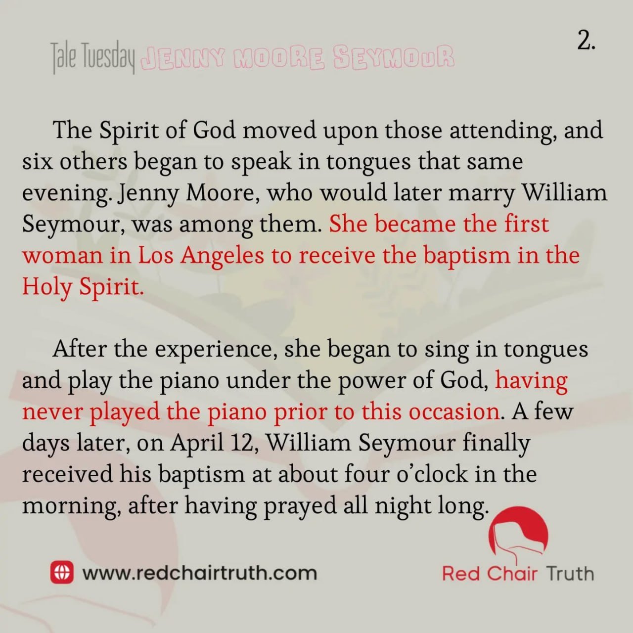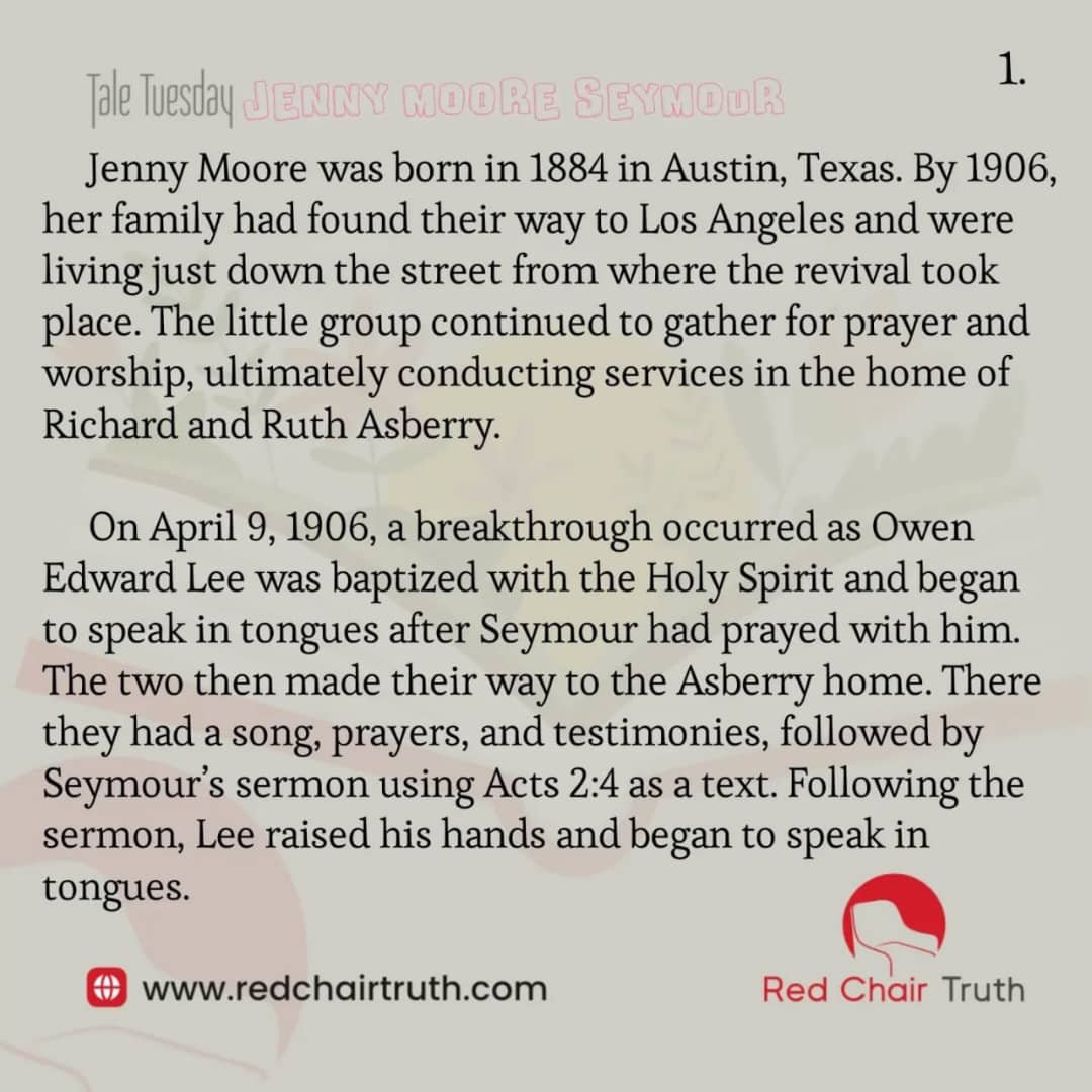 Jenny Moore was born in 1884 in Austin, Texas. By 1906, her family had found their way to Los Angeles and were living just down the street from where the revival took place. On April 9, 1906, she was among those who received the baptism of the Holy Spirit at the Asberry home, becoming the first woman in Los Angeles to do so.