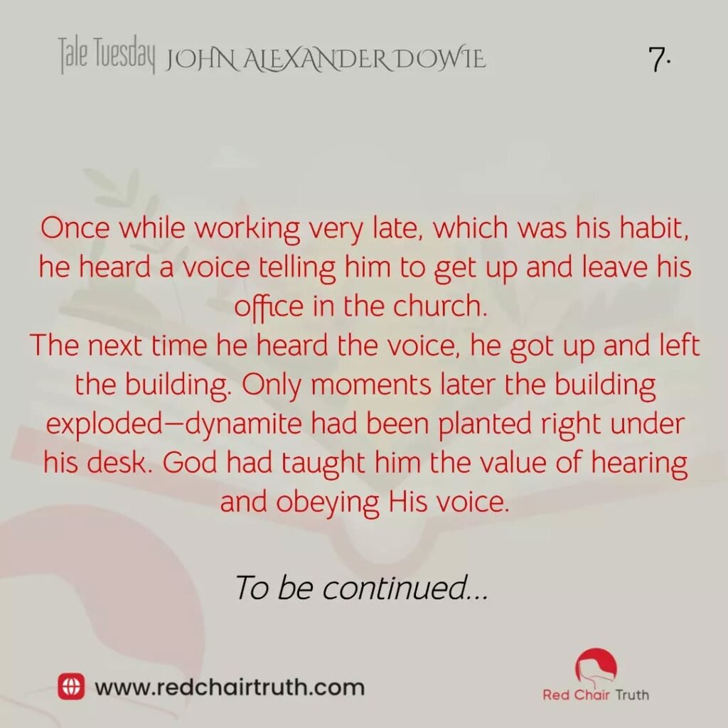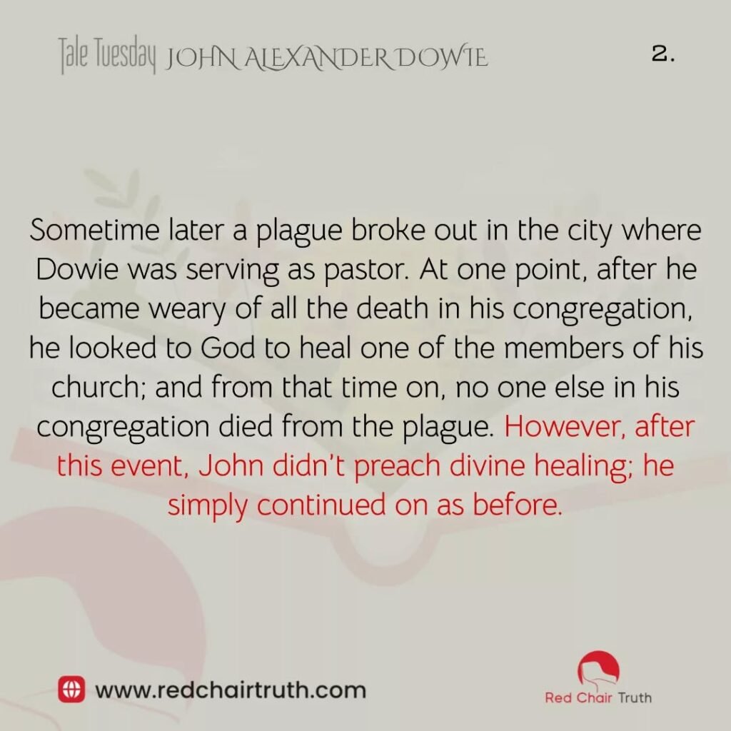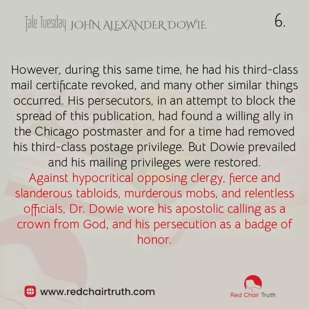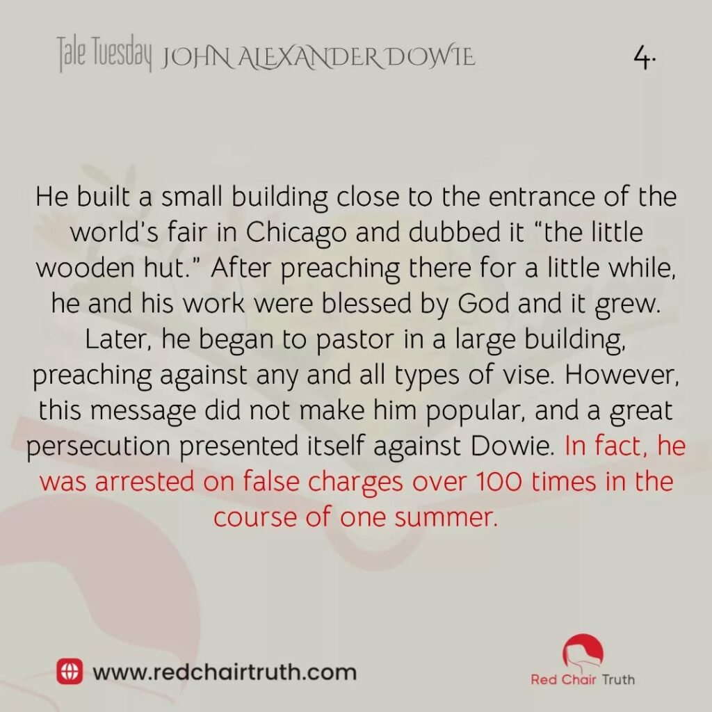 Later, he began to pastor in a large building, preaching against any and all types of vise. However, this message did not make him popular, and a great persecution presented itself against Dowie. In fact, he was arrested on false charges over 100 times in the course of one summer.