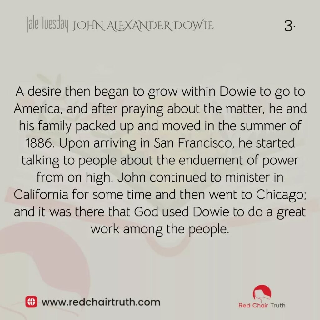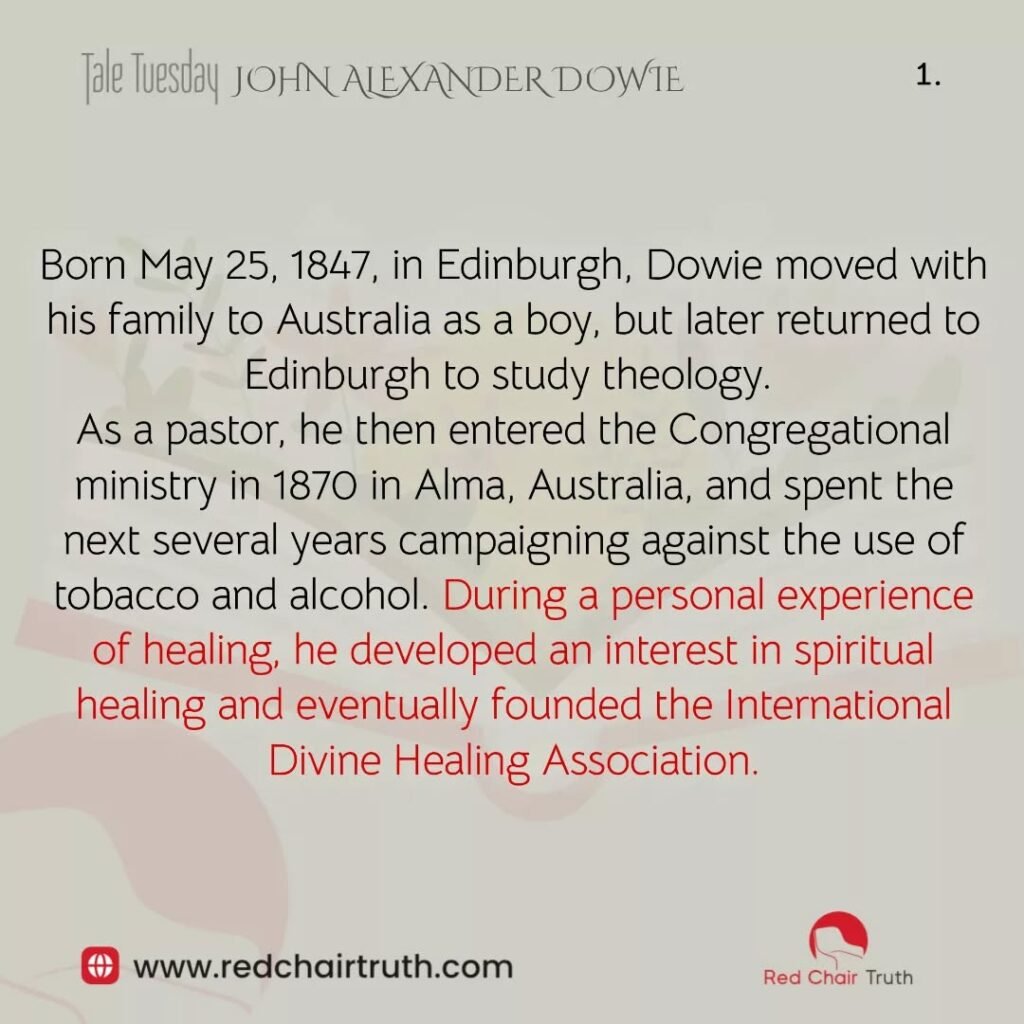 Born May 25, 1847, in Edinburgh, Dowie moved with his family to Australia as a boy, but later returned to Edinburgh to study theology. As a pastor, he then entered the Congregational ministry in 1870 in Alma, Australia, and spent the next several years campaigning against the use of tobacco and alcohol. During a personal experience of healing, he developed an interest in spiritual healing and eventually founded the International Divine Healing Association.