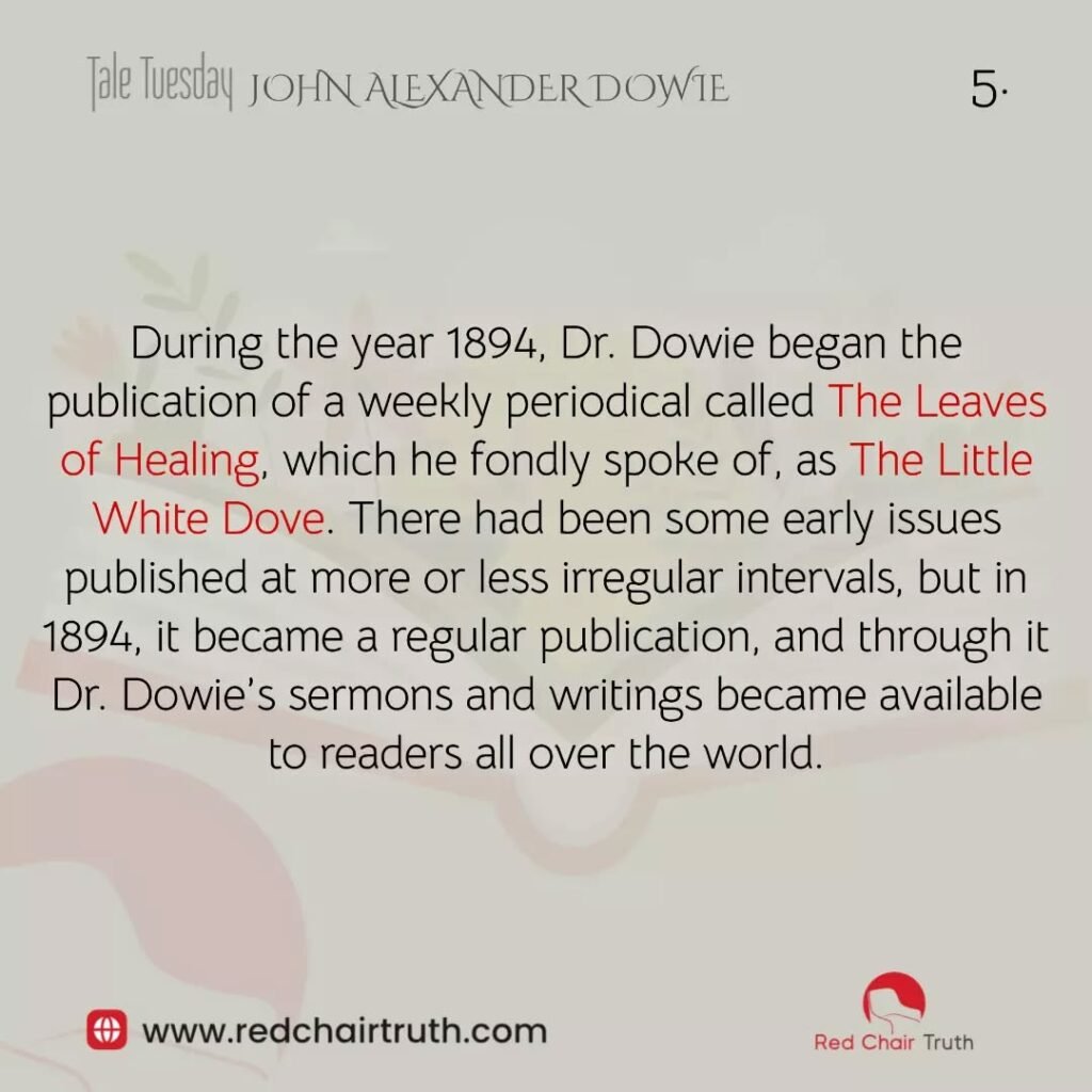 During the year 1894, Dr. Dowie began the publication of a weekly periodical called The Leaves of Healing, which he fondly spoke of, as The Little White Dove. There had been some early issues published at more or less irregular intervals, but in 1894, it became a regular publication, and through it Dr. Dowie’s sermons and writings became available to readers all over the world. However, during this same time, he had his third-class mail certificate revoked, and many other similar things occurred. His persecutors, in an attempt to block the spread of this publication, had found a willing ally in the Chicago postmaster and for a time had removed his third-class postage privilege. But Dowie prevailed and his mailing privileges were restored. Against hypocritical opposing clergy, fierce and slanderous tabloids, murderous mobs, and relentless officials, Dr. Dowie wore his apostolic calling as a crown from God, and his persecution as a badge of honor.