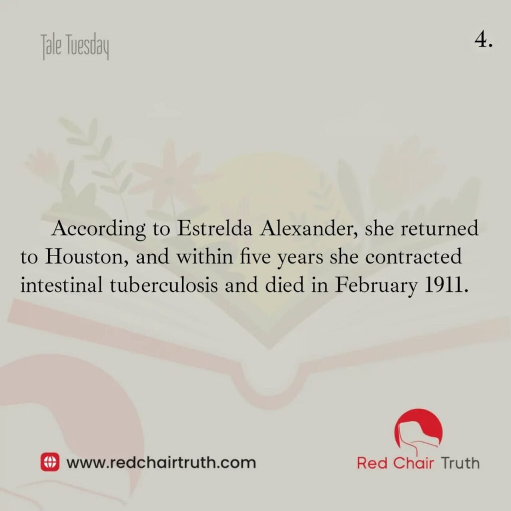 According to Estrelda Alexander, she returned to Houston, and within five years she contracted intestinal tuberculosis and died in February 1911.