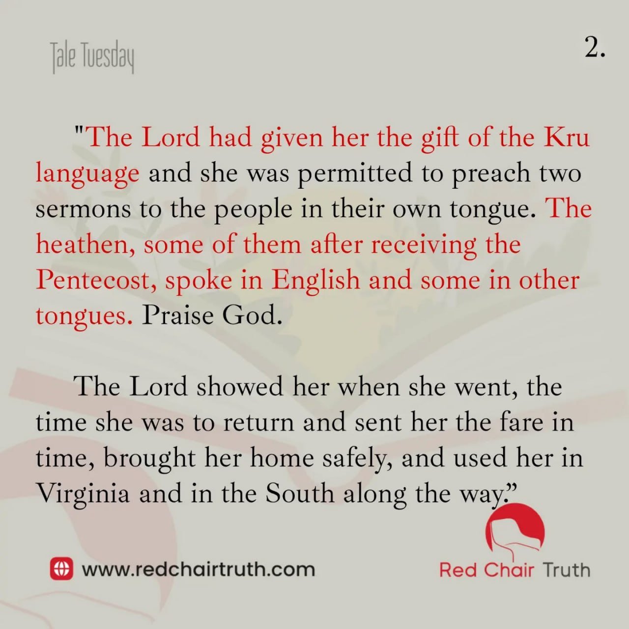 The heathen, some of them after receiving the Pentecost, spoke in English and some in other tongues. Praise God. The Lord showed her when she went, the time she was to return and sent her the fare in time, brought her home safely, and used her in Virginia and in the South along the way.”