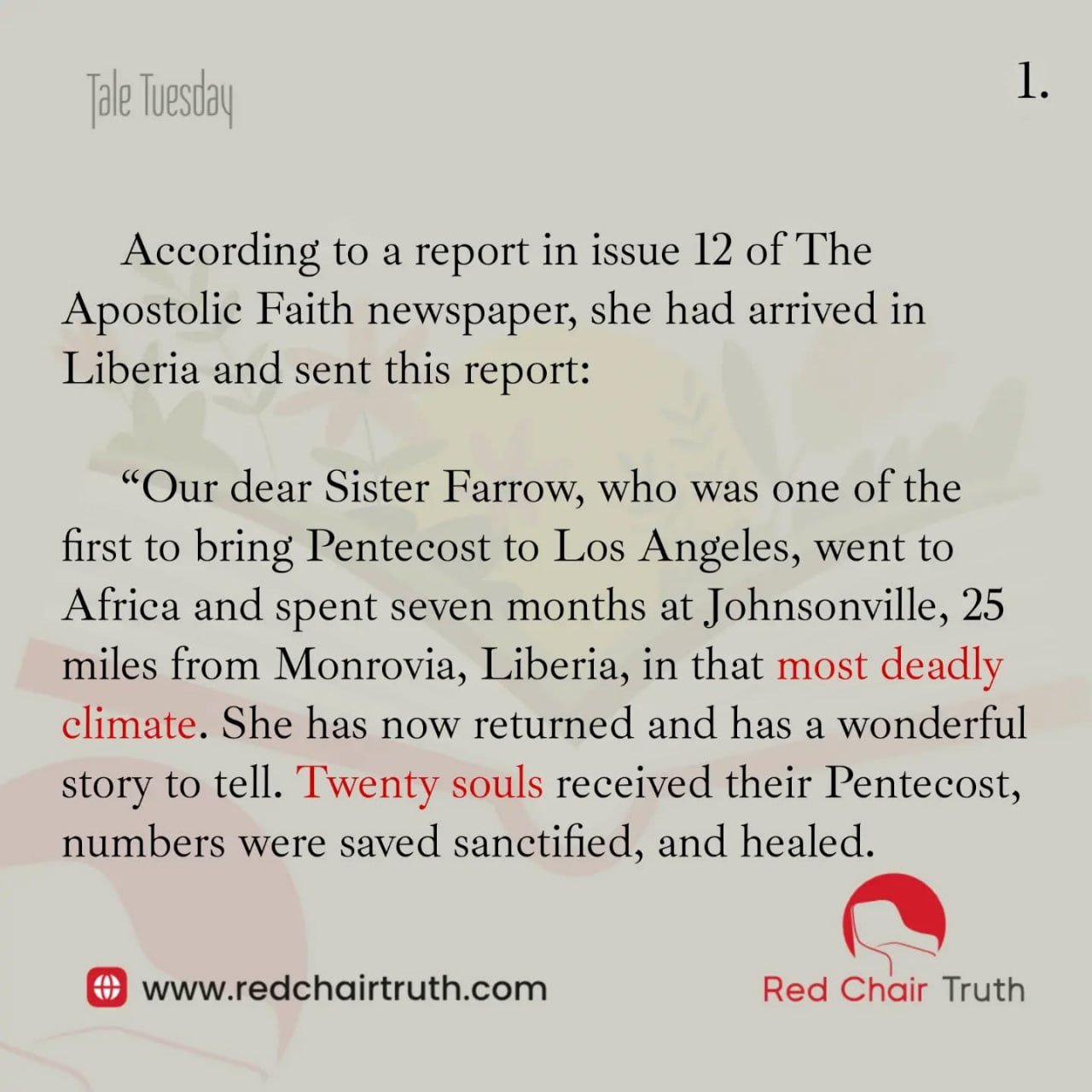 According to a report in issue 12 of The Apostolic Faith newspaper, she had arrived in Liberia and sent this report: “Our dear Sister Farrow, who was one of the first to bring Pentecost to Los Angeles, went to Africa and spent seven months at Johnsonville, 25 miles from Monrovia, Liberia, in that most deadly climate. She has now returned and has a wonderful story to tell. Twenty souls received their Pentecost, numbers were saved sanctified, and healed. “The Lord had given her the gift of the Kru language and she was permitted to preach two sermons to the people in their own tongue.