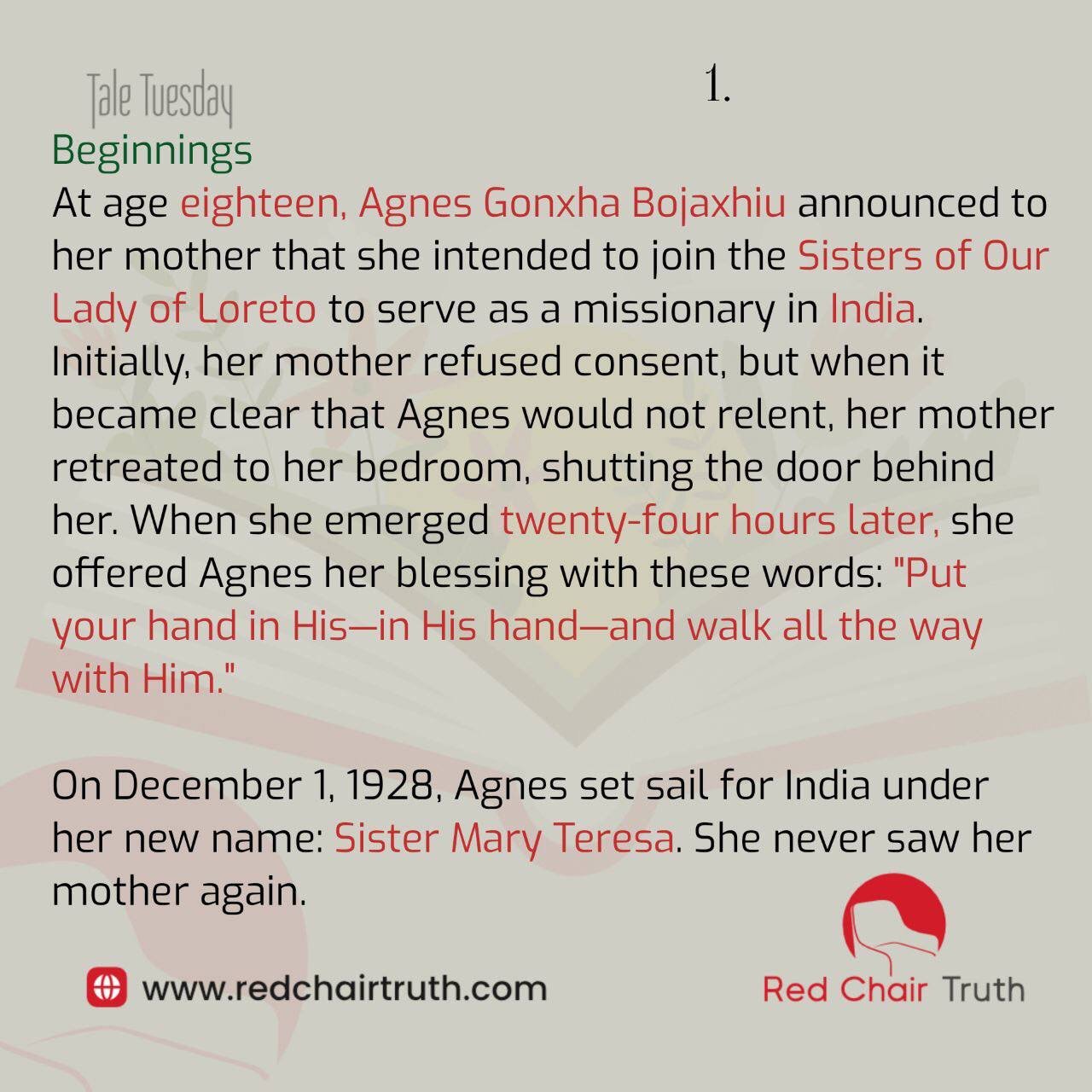 At age eighteen, Agnes Gonxha Bojaxhiu told her mother she intended to join the Sisters of Our Lady of Loreto to serve as a missionary in India. Initially, her mother refused, but when it became clear that Agnes would not relent, her mother withdrew to her bedroom. Twenty-four hours later, she returned and gave her blessing:
