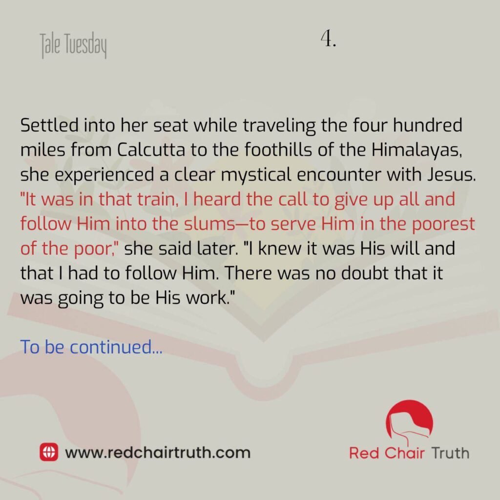 “It was in that train, I heard the call to give up all and follow Him into the slums—to serve Him in the poorest of the poor. I knew it was His will and that I had to follow Him. There was no doubt that it was going to be His work.”