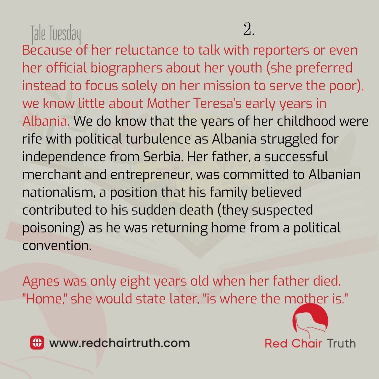 Little is known about Mother Teresa’s early years in Albania, as she rarely spoke about them. Her childhood coincided with political turbulence, as Albania struggled for independence from Serbia. Her father, a successful merchant and Albanian nationalist, died suddenly under suspicious circumstances while returning from a political convention. Agnes was only eight years old.