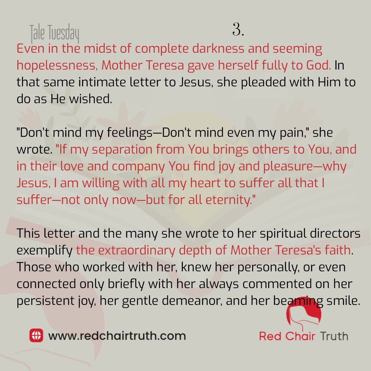“In my soul, I feel just that terrible pain of loss – of God not wanting me – of God not being God – of God not really existing… In my heart this is not faith – not light – not trust – there is so much pain – the pain of longing, the pain of not being wanted… I want God with all the powers of my soul – and yet there between us – there is a terrible separation.” Even amidst this darkness, she gave herself fully to God. In the same letter, she pleaded: