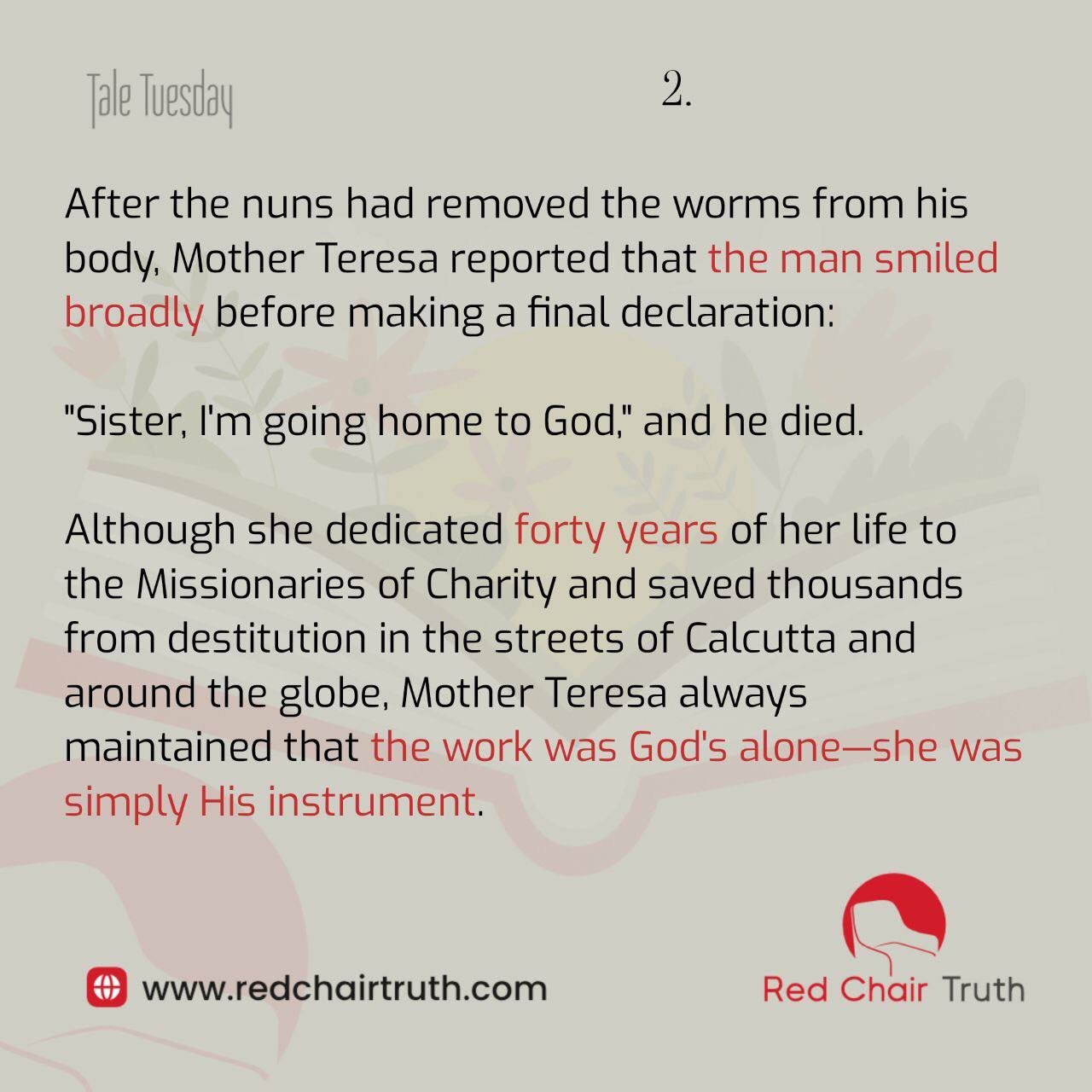 After the nuns had removed the worms from his body, Mother Teresa reported that the man smiled broadly before making a final declaration