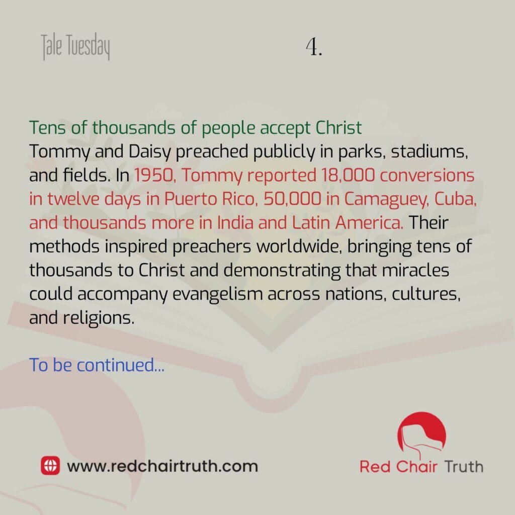 In California, Tommy met Daisy Marie Washburn at one of his revival meetings. After months of letters, they married on Easter Sunday, April 5, 1942, in Los Banos, California. Tommy was 18 and Daisy was 17. He borrowed a suit, bought a white carnation for Daisy, and hitchhiked the last hundred miles to reach her.
