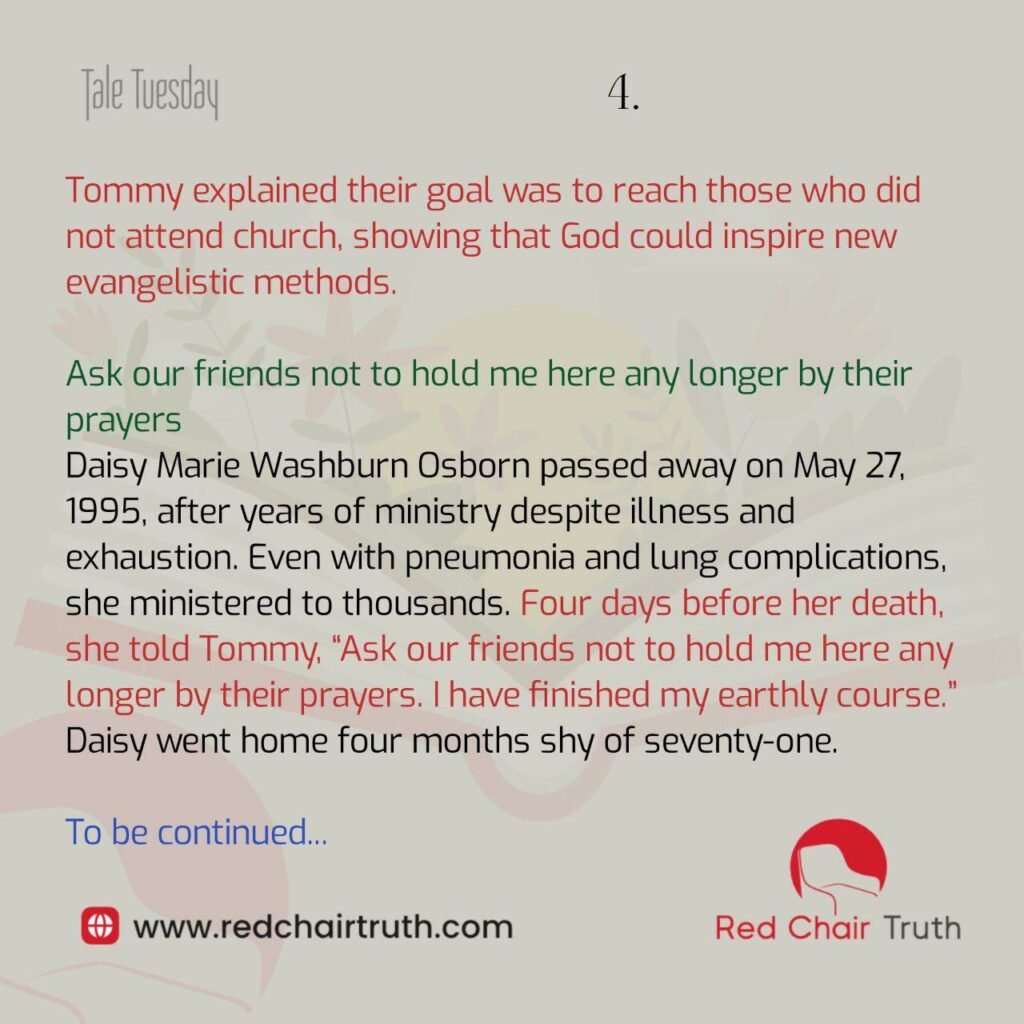 Daisy Marie Washburn Osborn passed away on May 27, 1995, after many years of faithful ministry marked by illness and exhaustion. Even while battling pneumonia and lung complications, she continued ministering to thousands of people.