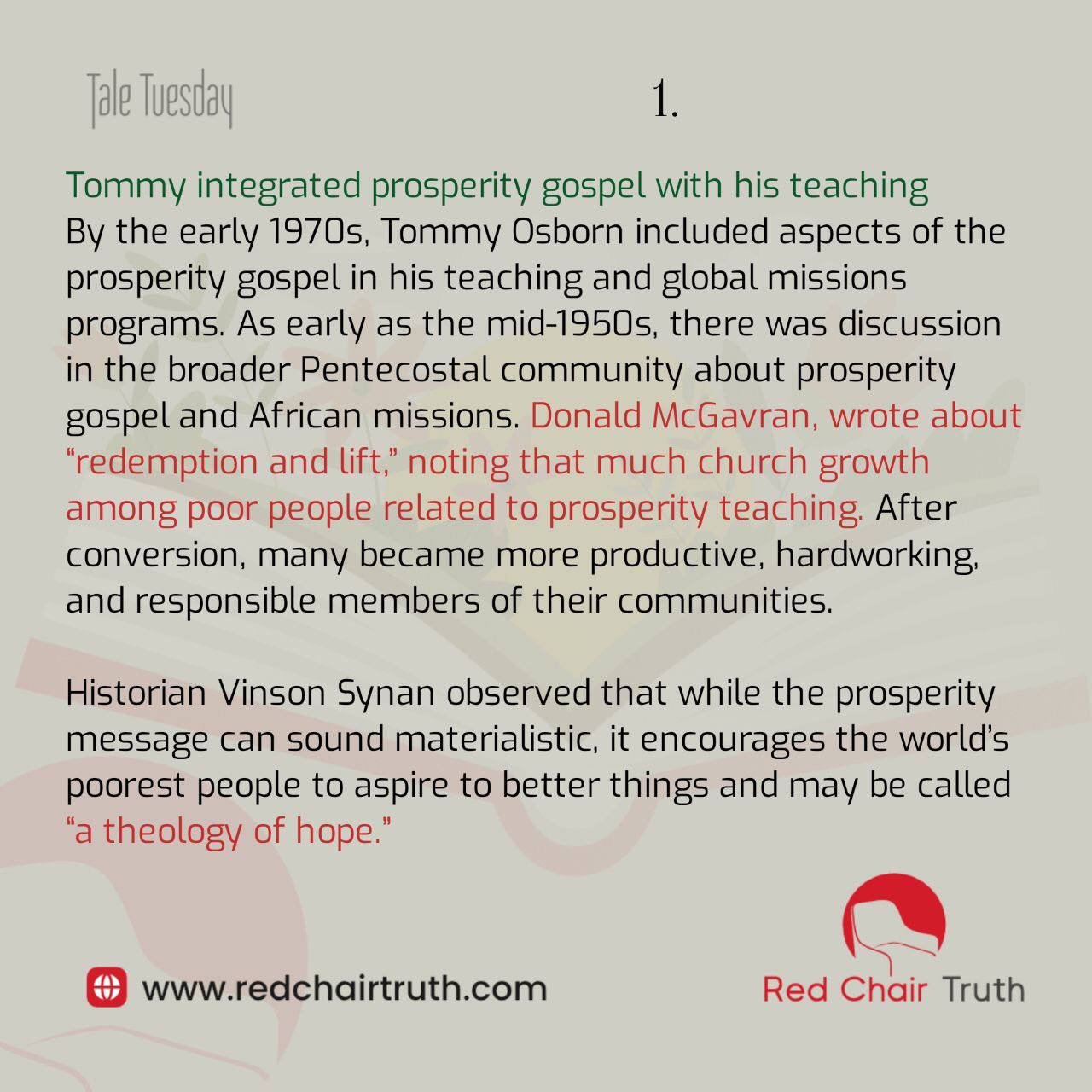 By the early 1970s, Tommy Osborn began to include aspects of the prosperity gospel in his teaching and global missions programmes. Discussions about prosperity teaching and African missions had already begun within the wider Pentecostal movement as far back as the mid-1950s.