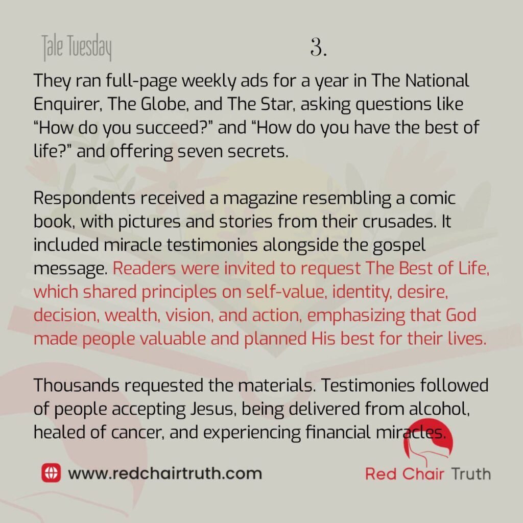 They promised seven secrets to a better life. Those who responded received a magazine designed like a comic book, filled with pictures and stories from Osborn crusades. It included miracle testimonies alongside the gospel message.