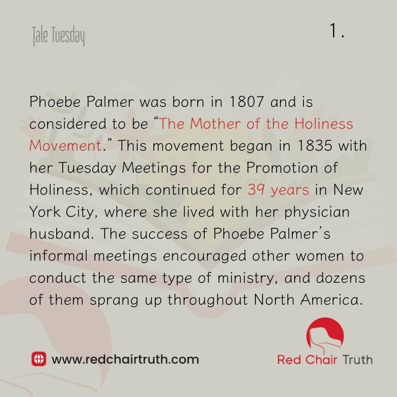 Phoebe Palmer was born in 1807 and is considered to be “The Mother of the Holiness Movement.” This movement began in 1835 with her Tuesday Meetings for the Promotion of Holiness, which continued for 39 years in New York City, where she lived with her physician husband.