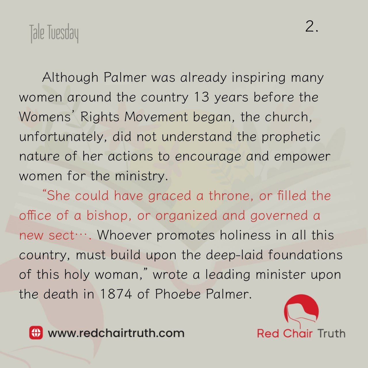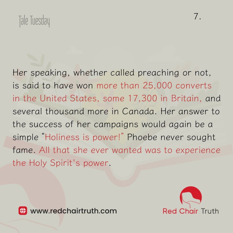 She could have graced a throne, or filled the office of a bishop, or organized and governed a new sect…. Whoever promotes holiness in all this country, must build upon the deep-laid foundations of this holy woman,” wrote a leading minister upon the death in 1874 of Phoebe Palmer.