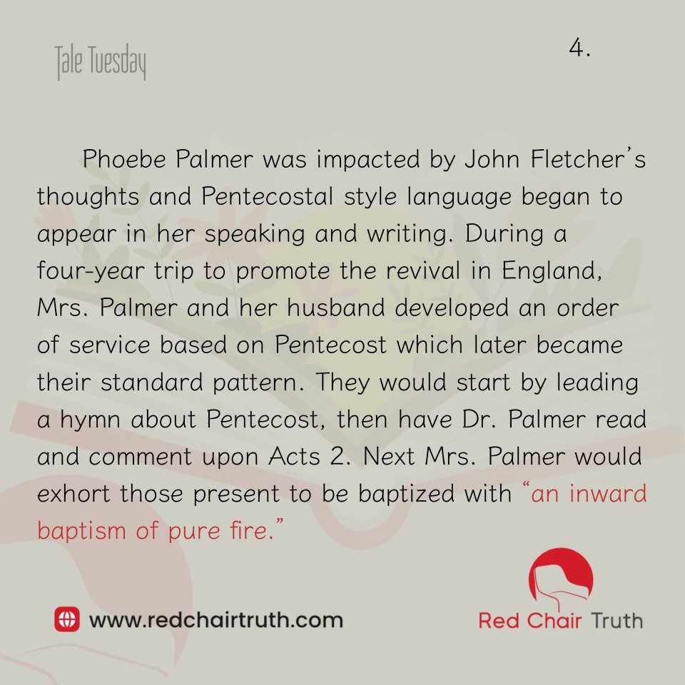 Phoebe Palmer was impacted by John Fletcher’s thoughts and Pentecostal style language began to appear in her speaking and writing. During a four-year trip to promote the revival in England, Mrs. Palmer and her husband developed an order of service based on Pentecost which later became their standard pattern.