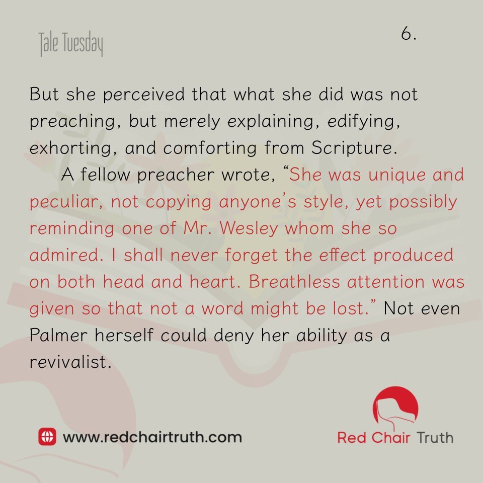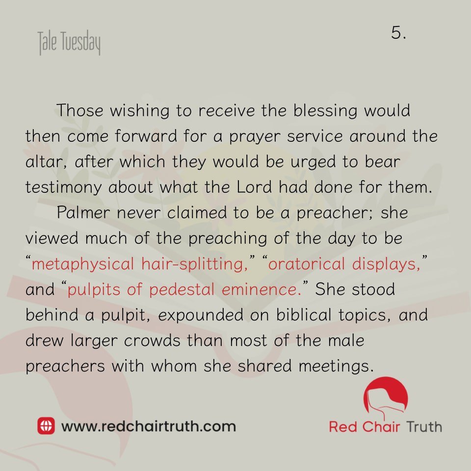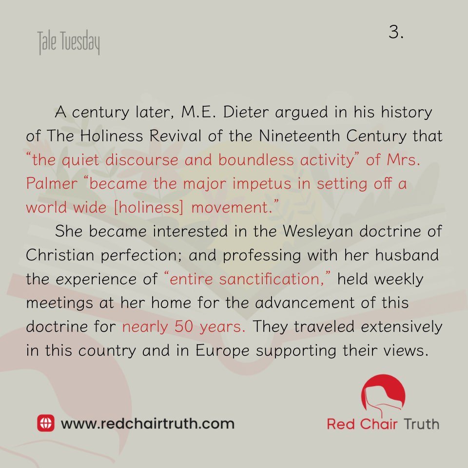 A century later, M.E. Dieter argued in his history of The Holiness Revival of the Nineteenth Century that “the quiet discourse and boundless activity of Mrs. Palmer “became the major impetus in setting off a world wide [holiness] movement.”