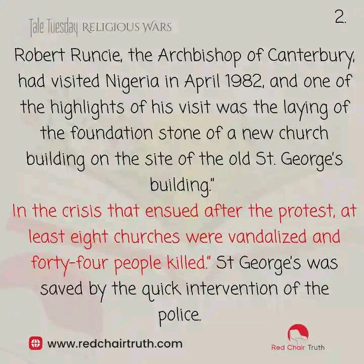 Robert Runcie, the Archbishop of Canterbury, had visited Nigeria in April 1982, and one of the highlights of his visit was the laying of the foundation stone of a new church building on the site of the old St. George’s building.” In the crisis that ensued after the protest, at least eight churches were vandalized and forty-four people killed.” St George’s was saved by the quick intervention of the police.