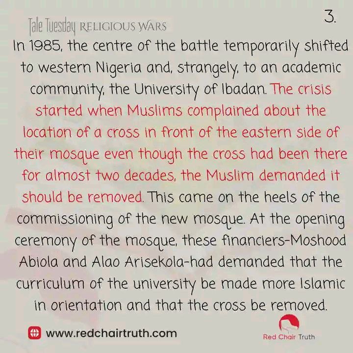 In 1985, the centre of the battle temporarily shifted to western Nigeria and, strangely, to an academic community, the University of Ibadan. The crisis started when Muslims complained about the location of a cross in front of the eastern side of their mosque even though the cross had been there for almost two decades, the Muslim demanded it should be removed. This came on the heels of the commissioning of the new mosque. At the opening ceremony of the mosque, these financiers-Moshood Abiola and Alao Arisekola-had demanded that the curriculum of the university be made more Islamic in orientation and that the cross be removed.