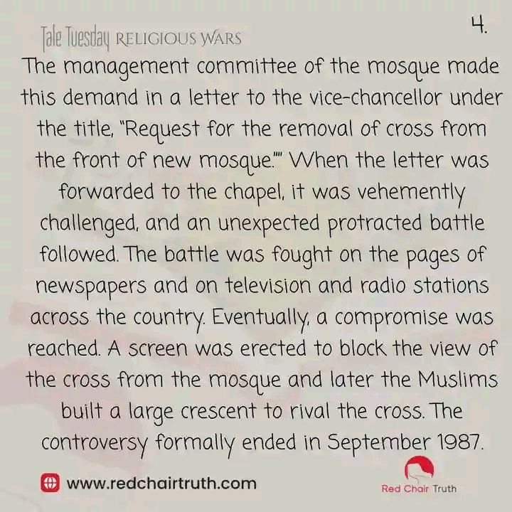 The management committee of the mosque made this demand in a letter to the vice-chancellor under the title, “Request for the removal of cross from the front of new mosque.” When the letter was forwarded to the chapel, it was vehemently challenged, and an unexpected protracted battle followed. The battle was fought on the pages of newspapers and on television and radio stations across the country. Eventually, a compromise was reached. A screen was erected to block the view of the cross from the mosque and later the Muslims built a large crescent to rival the cross. The controversy formally ended in September 1987.
