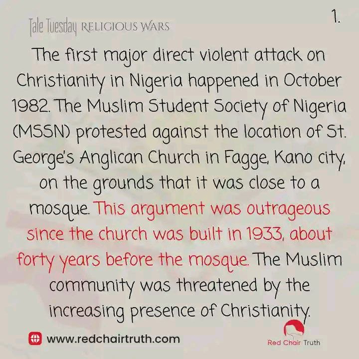 The first major direct violent attack on Christianity in Nigeria happened in October 1982. The Muslim Student Society of Nigeria (MSSN) protested against the location of St. George’s Anglican Church in Fagge, Kano city, on the grounds that it was close to a mosque. This argument was outrageous since the church was built in 1933, about forty years before the mosque. The Muslim community was threatened by the increasing presence of Christianity.