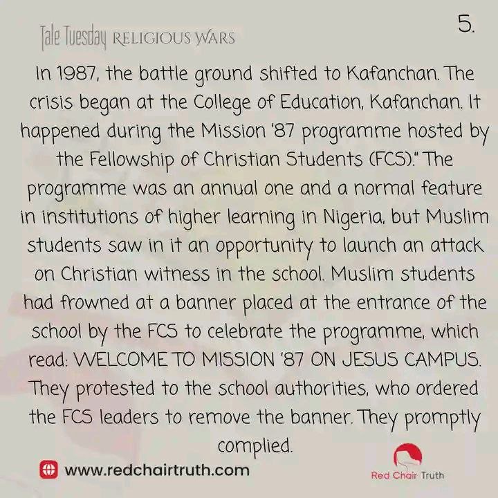 In 1987, the battle ground shifted to Kafanchan. The crisis began at the College of Education, Kafanchan. It happened during the Mission ’87 programme hosted by the Fellowship of Christian Students (FCS).” The programme was an annual one and a normal feature in institutions of higher learning in Nigeria, but Muslim students saw in it an opportunity to launch an attack on Christian witness in the school. Muslim students had frowned at a banner placed at the entrance of the school by the FCS to celebrate the programme, which read: WELCOME TO MISSION ’87 ON JESUS CAMPUS. They protested to the school authorities, who ordered the FCS leaders to remove the banner. They promptly complied.