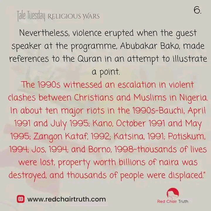 Nevertheless, violence erupted when the guest speaker at the programme, Abubakar Bako, made references to the Quran in an attempt to illustrate a point. The 1990s witnessed an escalation in violent clashes between Christians and Muslims in Nigeria. In about ten major riots in the 1990s-Bauchi, April 1991 and July 1995; Kano, October 1991 and May 1995; Zangon Kataf, 1992; Katsina, 1991; Potiskum, 1994; Jos, 1994; and Borno, 1998-thousands of lives were lost, property worth billions of naira was destroyed, and thousands of people were displaced.”
