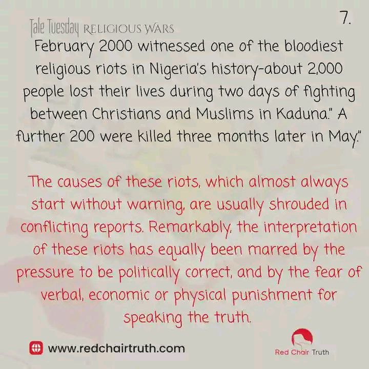 February 2000 witnessed one of the bloodiest religious riots in Nigeria’s history-about 2,000 people lost their lives during two days of fighting between Christians and Muslims in Kaduna.” A further 200 were killed three months later in May.” The causes of these riots, which almost always start without warning, are usually shrouded in conflicting reports. Remarkably, the interpretation of these riots has equally been marred by the pressure to be politically correct, and by the fear of verbal, economic or physical punishment for speaking the truth.