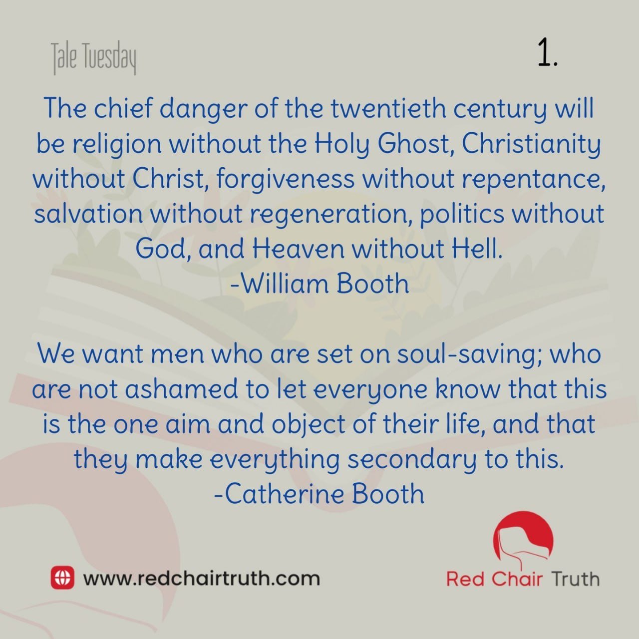 The chief danger of the twentieth century will be religion without the Holy Ghost, Christianity without Christ, forgiveness without repentance, salvation without regeneration, politics without God, and Heaven without Hell. -William Booth