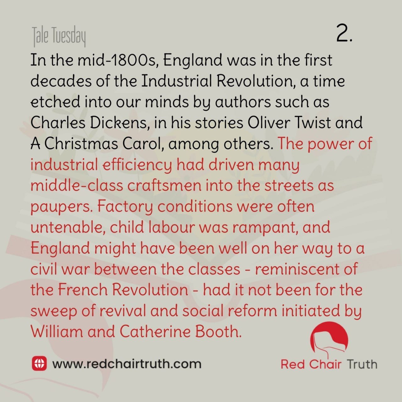 In the mid-1800s, England was in the first decades of the Industrial Revolution, a time etched into our minds by authors such as Charles Dickens, in his stories Oliver Twist and A Christmas Carol, among others. The power of industrial efficiency had driven many middle-class craftsmen into the streets as paupers. Factory conditions were often untenable, child labour was rampant, and England might have been well on her way to a civil war between the classes – reminiscent of the French Revolution – had it not been for the sweep of revival and social reform initiated by William and Catherine Booth.