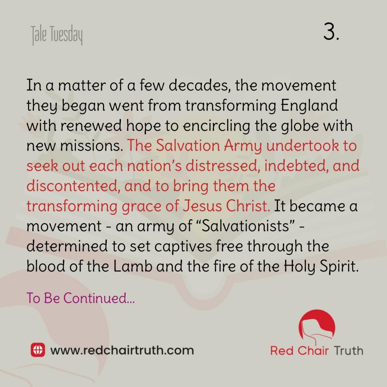 In a matter of a few decades, the movement they began went from transforming England with renewed hope to encircling the globe with new missions. The Salvation Army undertook to seek out each nation’s distressed, indebted, and discontented, and to bring them the transforming grace of Jesus Christ. It became a movement – an army of “Salvationists” – determined to set captives free through the blood of the Lamb and the fire of the Holy Spirit. TO BE CONTINUED…