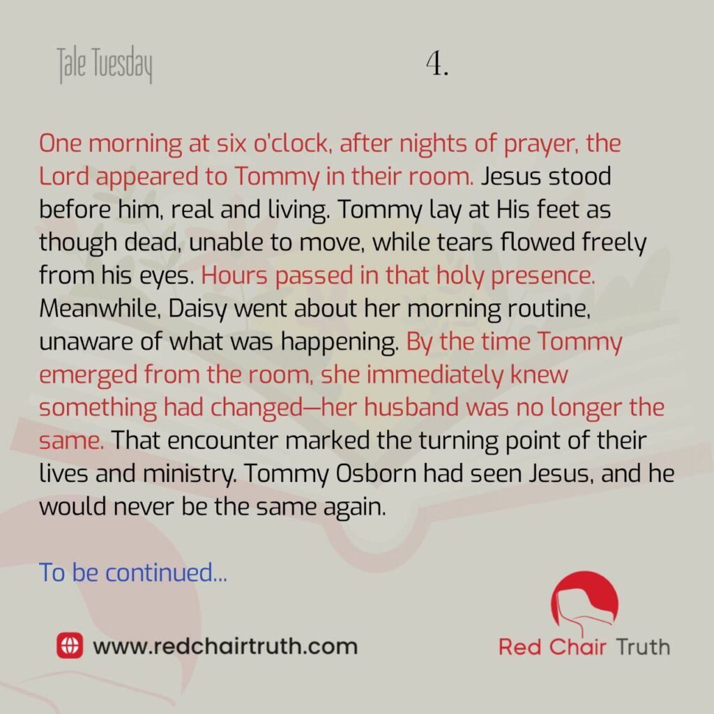 In California, Tommy met Daisy Marie Washburn at one of his revival meetings. After months of letters, they married on Easter Sunday, April 5, 1942, in Los Banos, California. Tommy was 18 and Daisy was 17. He borrowed a suit, bought a white carnation for Daisy, and hitchhiked the last hundred miles to reach her.