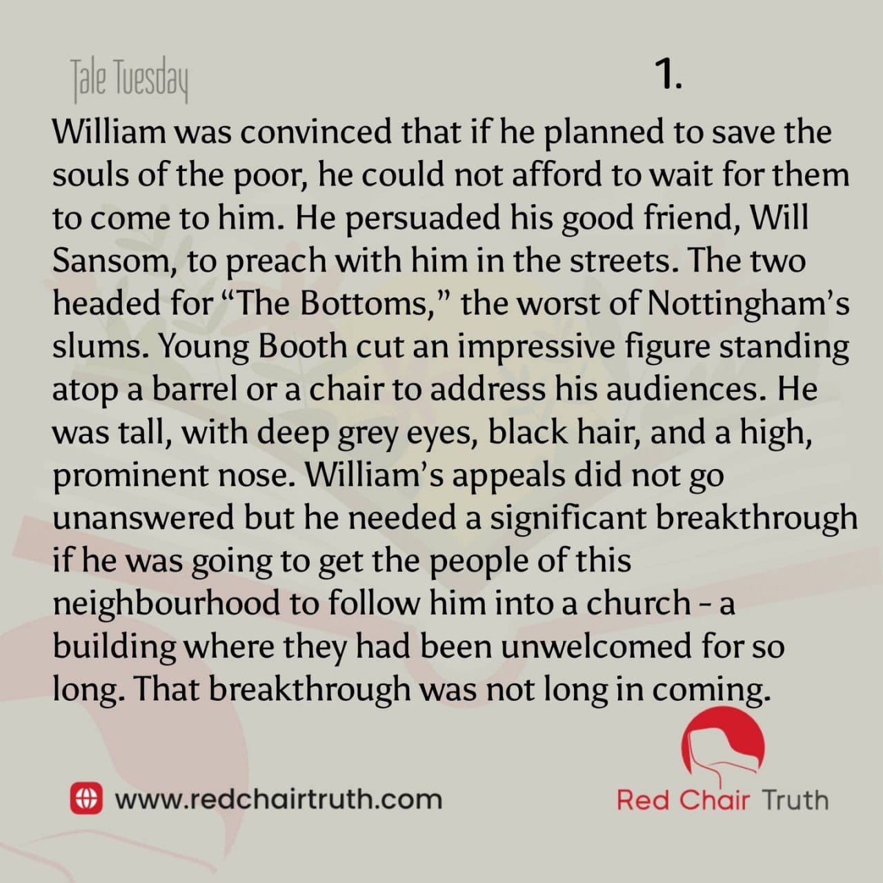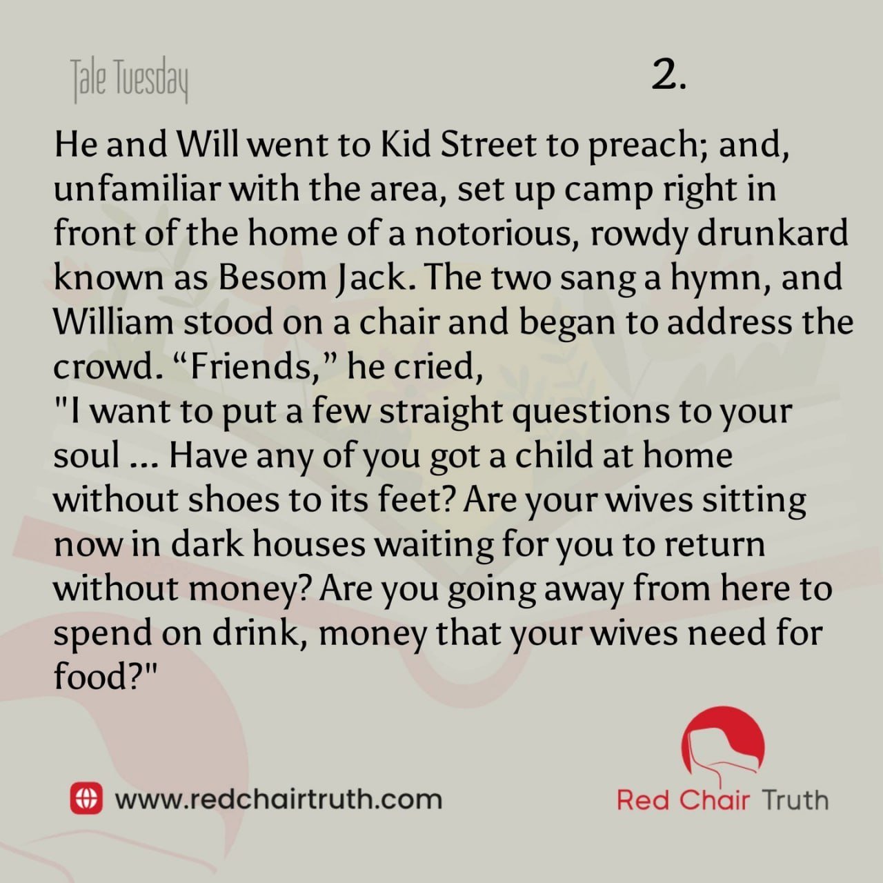 He and Will went to Kid Street to preach and unfamiliar with the area, set up camp right in front of the home of a notorious, rowdy drunkard known as Besom Jack. The two sang a hymn, and William stood on a chair and began to address the crowd. “Friends,” he cried, “I want to put a few straight questions to your soul … Have any of you got a child at home without shoes to its feet? Are your wives sitting now in dark houses waiting for you to return without money? Are you going away from here to spend on drink, money that your wives need for food?”