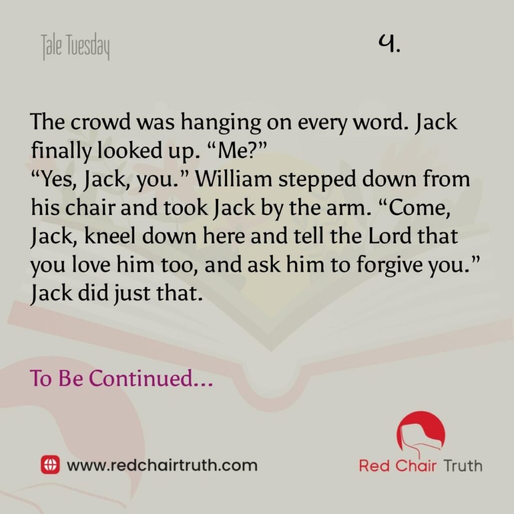 The crowd was hanging on every word. Jack finally looked up. “Me?” “Yes, Jack, you.” William stepped down from his chair and took Jack by the arm. “Come, Jack, kneel down here and tell the Lord that you love him too, and ask him to forgive you.” Jack did just that.