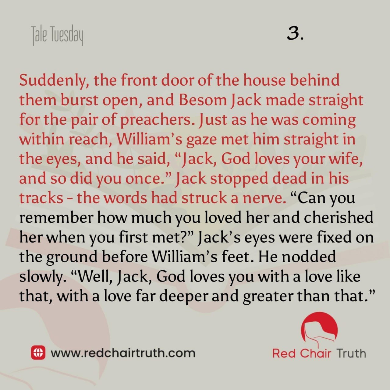 Suddenly, the front door of the house behind them burst open, and Besom Jack made straight for the pair of preachers. Just as he was coming within reach, William’s gaze met him straight in the eyes, and he said, “Jack, God loves your wife, and so did you once.” Jack stopped dead in his tracks the words had struck a nerve. “Can you remember how much you loved her and cherished her when you first met?” Jack’s eyes were fixed on the ground before William’s feet. He nodded slowly. “Well, Jack, God loves you with a love like that, with a love far deeper and greater than that.”