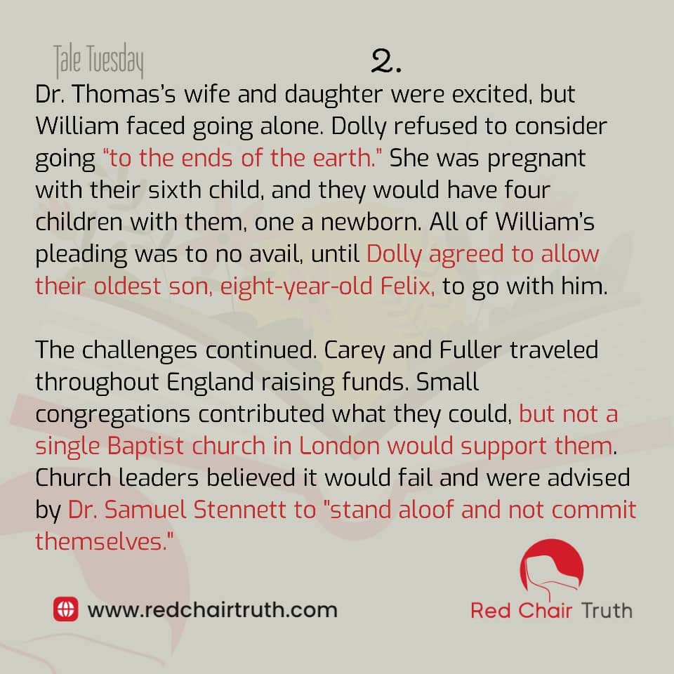 The challenges continued. Carey and Fuller travelled throughout England raising funds. Small congregations contributed what they could, but not a single Baptist church in London would support them. Church leaders believed it would fail and were advised by Dr. Samuel Stennett to “stand aloof and not commit themselves.”