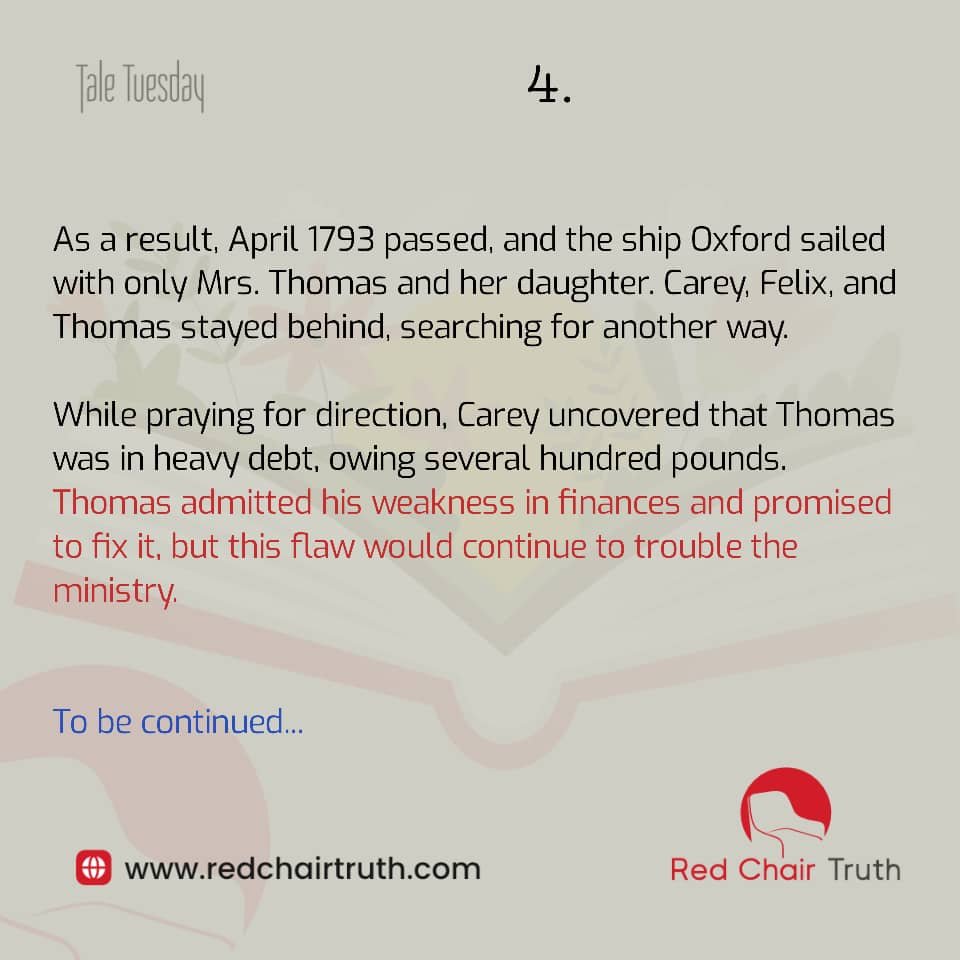 While praying for direction, Carey uncovered that Thomas was in heavy debt, owing several hundred pounds. Thomas admitted his weakness in finances and promised to fix it, but this flaw would continue to trouble the ministry.